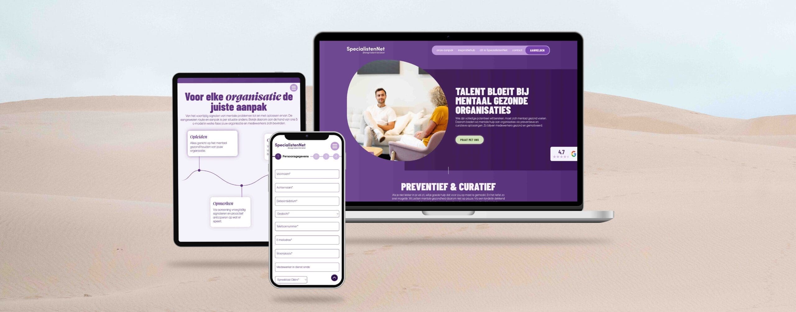 De herpositionering leidde tot een aangepaste tone-of-voice en nieuwe pay-off: “Brengt talent tot bloei“. Omdat SpecialistenNet al beschikte over een brandbook, is de nieuwe visuele identiteit verwerkt in het bestaande boek. Voor de nieuwe website hebben we een contentshoot verzorgd bij SpecialistenNet op locatie en in de Soester Duinen. Omdat het marketingteam van SpecialistenNet actief content creĆ«ert, is de website daarnaast voorzien van diverse functionaliteiten waarmee SpecialistenNet zelf eenvoudig content beheert. Tot slot hebben wij voor de campagne diverse concepten uitgedacht en voorgelegd.